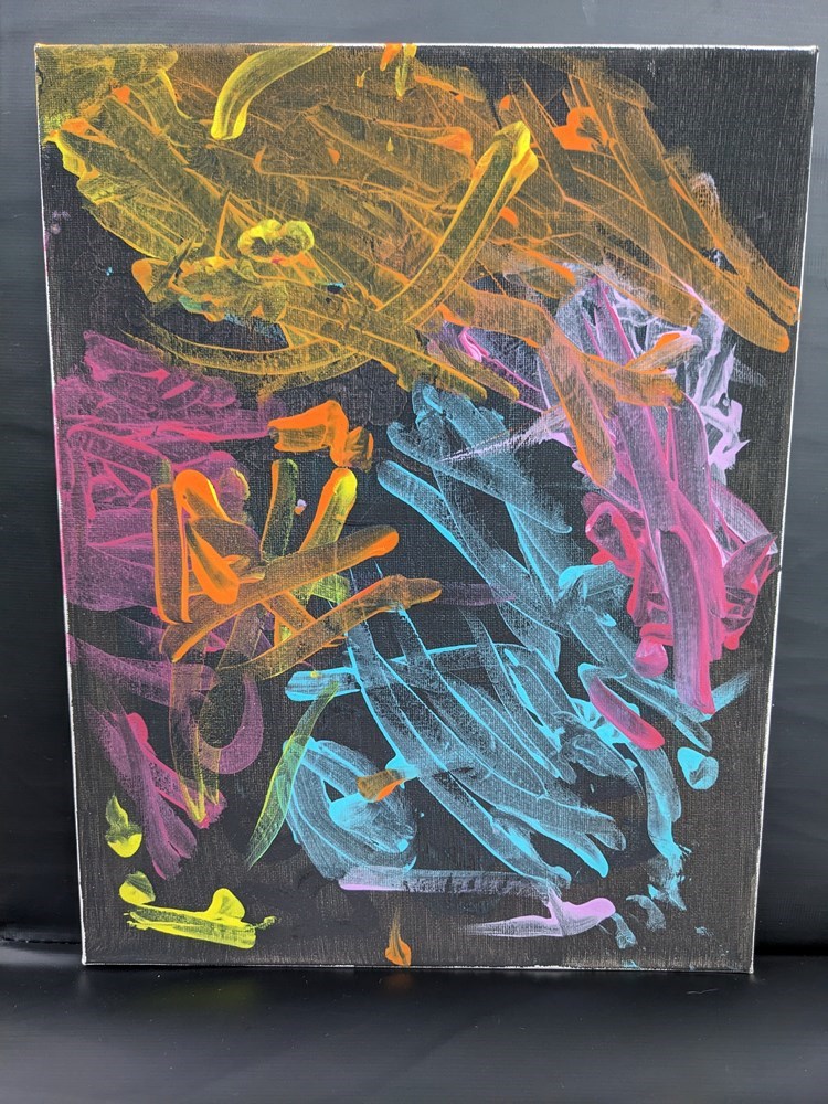 Collaborative art created by our PSS keiki featuring Neon Dreamscape on a black background. This item is on Kauai and can be picked up in Puhi. Should you reside off island, shipping of this item can be arranged at an additional charge to be arranged and paid prior to shipping. This is estimated at $25.