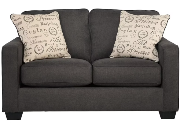 Loveseat The sleek mid-century lines of this loveseat are always in vogue. With neatly tailored box cushions and track arms, the microfiber upholstered loveseat is supremely comfortable and stylish. Tonal piping and a pair of printed pillows further refine the silhouette. About Alenya The sleek style of the track arms along with the boxed seat and back cushions all supported by dark finish legs makes the warm inviting casual design of the Alenya-Charcoal upholstery collection the perfecting addition to the relaxing decor of any living area. Product Features Corner-blocked frame Tight back and loose seat cushions High-resiliency foam cushions wrapped in thick poly fiber 2 decorative pillows included Pillows with soft polyfill Width 61" (154.9 cm) Depth 37 1/2" (95.2 cm) Height 38 1/2" (97.8 cm)