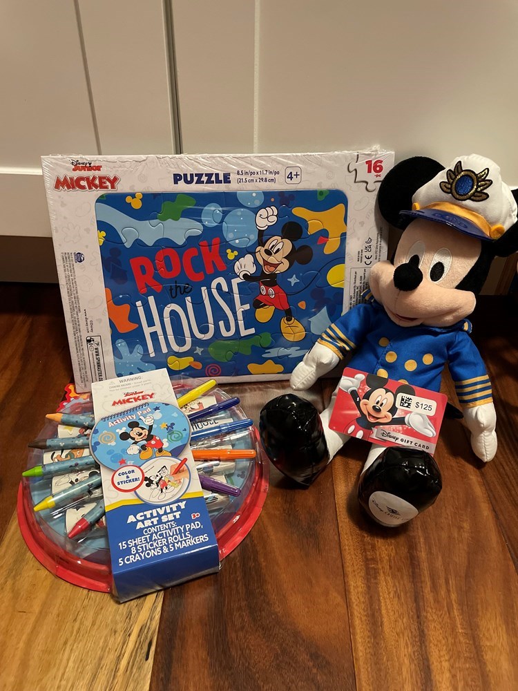 $125 Disney gift card with Mickey Mouse plush, puzzle, and colors.