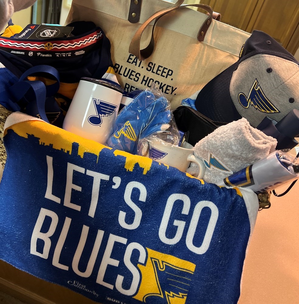 Assorted memorabilia from the St. Louis Blues, including canvas tote bag, Blue and grey Blues baseball cap, Let’s go Blues rally towel, “We went Blues” lanyard, Blues logo mini bag with shoulder strap, #18 Robert Thomas jersey rally towel, Pair of Blues logo gloves, Blues coffee cup, Chris Pronger mini banner, Blues logo wine tumbler, Blues logo fuzzy socks, Blues logo lanyard, Blues logo plastic tumbler with lid, Compact Blues umbrella, and Fanatics Blues jersey size XL.