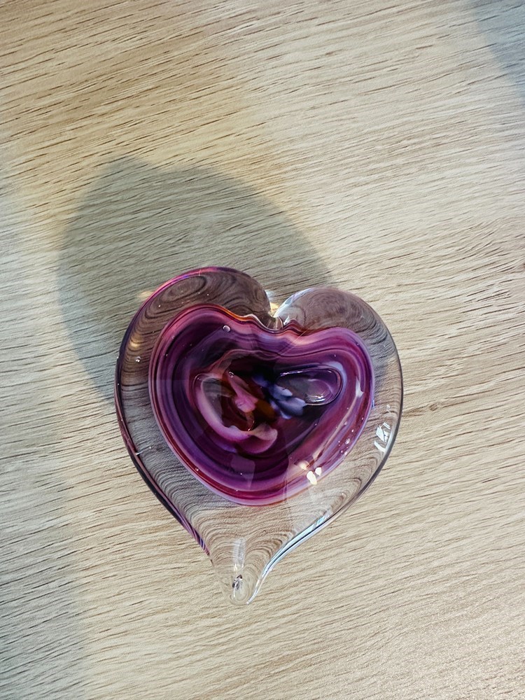 Hand made glass heart featuring swirls of pinks and purples. The delicate curves and surface catch light beautifully, making this piece a perfect symbol of affection.
