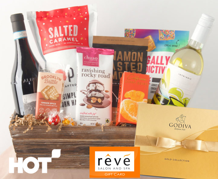 A luxurious box filled with wine and gourmet treats. Every box includes 1 red & 1 white bottles of wine, Godiva Chocolates, Poppy Popcorn, a Chuao Chocolate bar, cheesy wine chips and other gourmet treats! Plus $100 gift card to Reve Salon & Spa. IMPORTANT: Basket will be delivered to recipient's address approx. 3 days after auction ends and we receive address. Recipient must be 21+ years of age. Delivery driver will request to see valid ID at time of delivery.