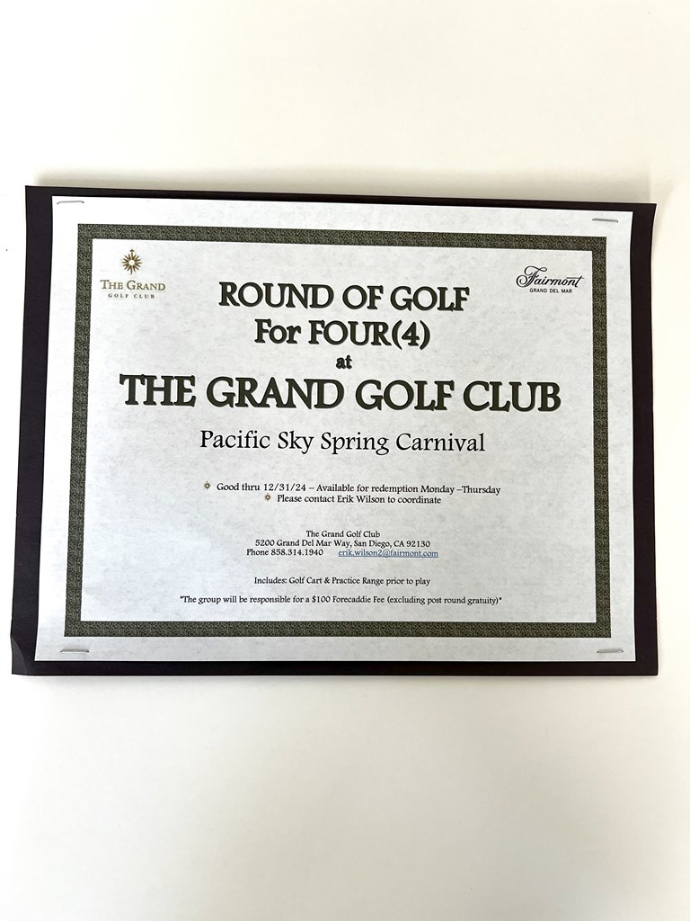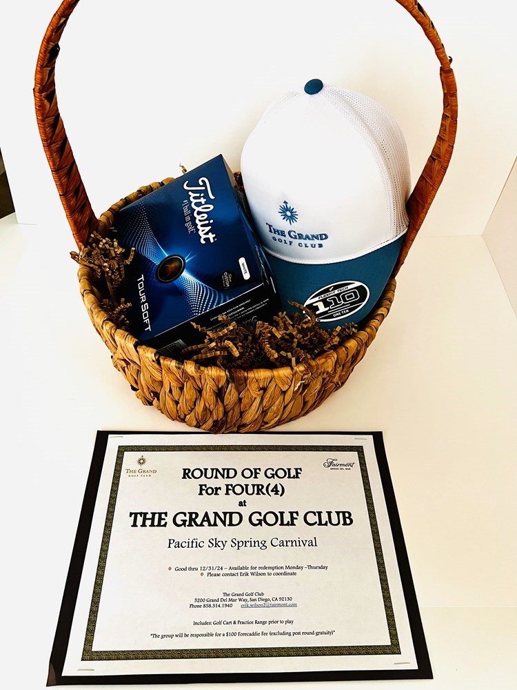 Enjoy a round of golf at the exclusive, members-only, Grand Golf Club! (Valid until 12/31/2024, M - Th redemption) 5200 Grand Del Mar Way, San Diego, CA 92130 Includes: -Practice Range -Golf Cart -Golf Balls -Cap Total value of the whole basket - $1600