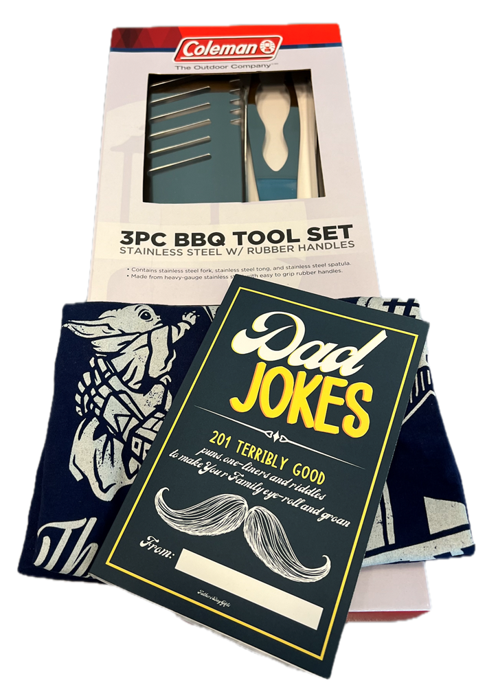Father's Day Basket ($50 value) 3 Piece BBQ Tool Set (Stainless Steel w/ Rubber Handles) 201 Terribly Good Dad Jokes Book Dadalorian Star Wars T-shirt (Medium size)