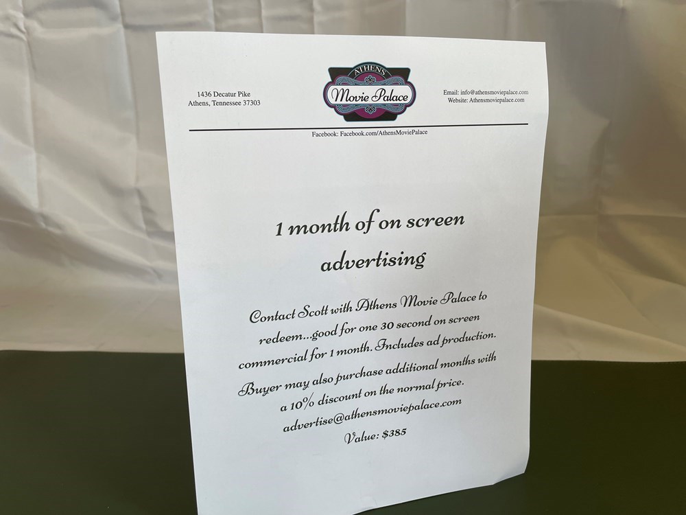 Good for one 30 second commercial on-screen for 1 full month. Includes ad production. Auction winner may also purchase additional months at a 10% discount.