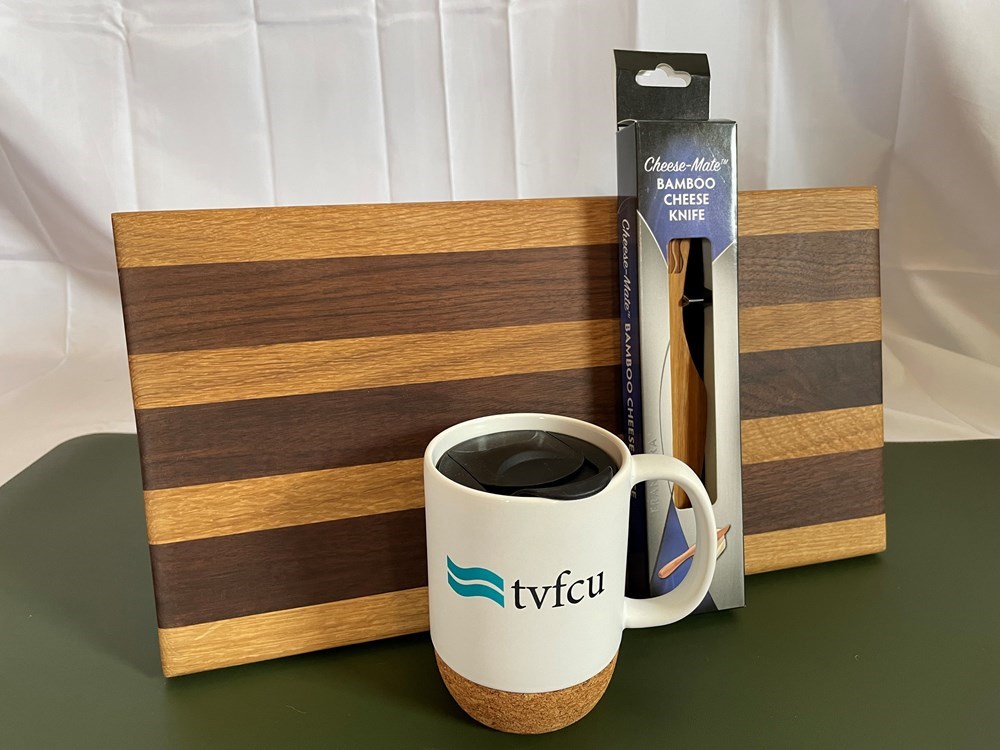 Wooden cutting board, bamboo knife, and ceramic mug provided by Tennessee Valley Federal Credit Union. Prize pack also includes other branded goodies provided by TVFCU. - Valued at over $50.00.