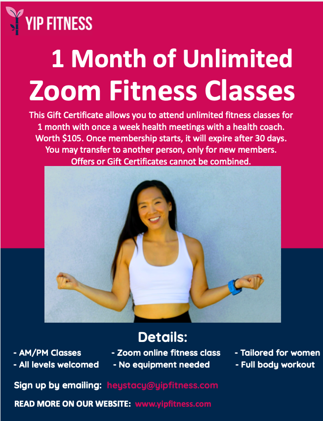 1-month unlimited Zoom Fitness Classes Yip Fitness: Live 1-hour Zoom online bodyweight training group fitness classes. Includes free one on one bi-weekly accountability coaching to meal-plan, learn accountability tricks, set daily habit goals, and manage stress. A 1-month membership for 30 days, cannot put a hold on the membership once started, it will expire after 30 days. Ages 13-80 years old. Tailored for women. No equipment is needed to do the workouts. All levels are welcomed to class because every movement has a beginner to advance option. No expiration date prior to start of 1 month membership You can give it as a gift, so it is transferable. No refunds. Cannot be combined with other gift certificates. Only for new members. Retail Value $105