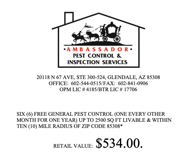 SIX (6) FREE GENERAL PEST CONTROL (ONE EVERY OTHER MONTH FOR ONE YEAR) UP TO 2500 SQ FT LIVABLE & WITHIN TEN (10) MILE RADIUS OF ZIP CODE 85308* Retail value $534